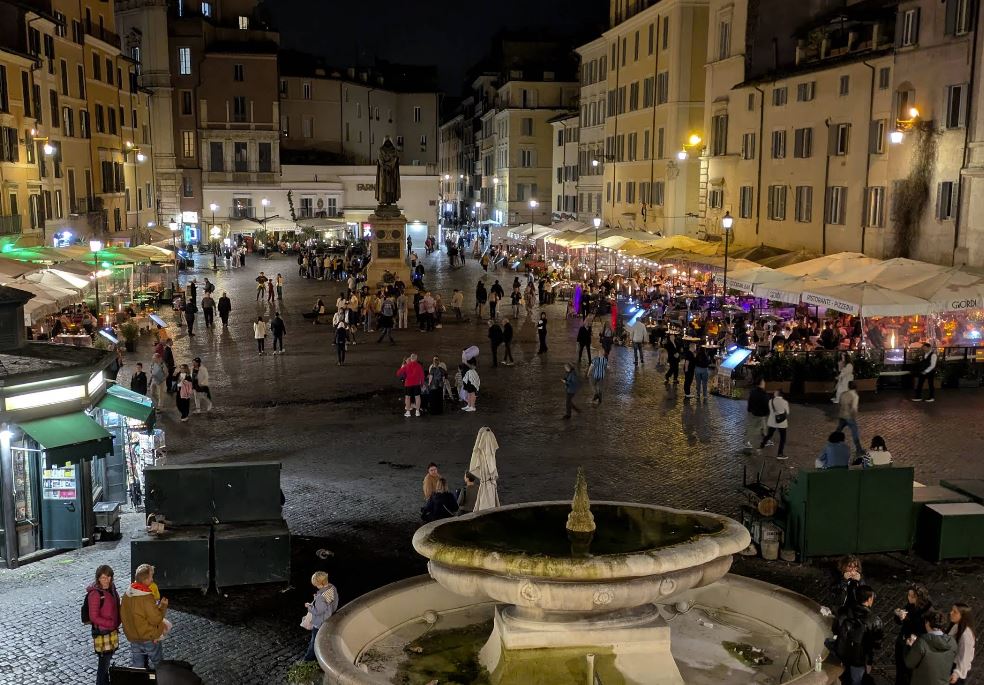 После полудня торговцы в центре пьяццы сворачиваются, и площадь с памятником казненному на ней Джордано Бруно превращается в место встреч. По периметру пьяццы открываются кафе, бары и рестораны с террасами. В общем, Кампо-де-Фьори это центр ночной жизни Рима.