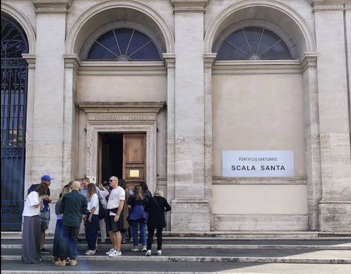 Священная лестница Scala Sancta перенесена в Италию из претория Пилата в IV веке. По этим 28 ступеням, согласно преданию, шел Христос перед началом судилища в день своей казни.